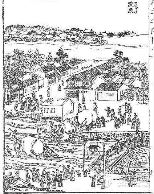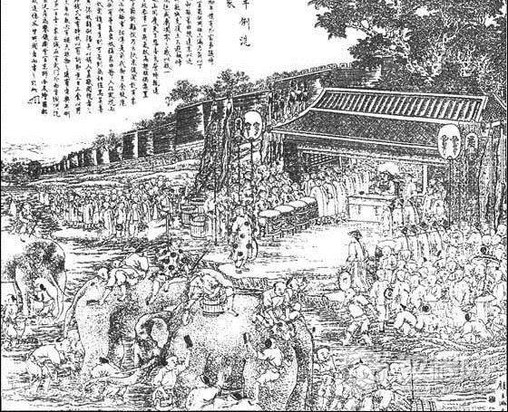 尤其是在清代北京的六月,时值人畜洗浴的“天贶节”,朝廷为了显示四海清平的气象,往往在此时举行“洗象”仪式。每逢初伏,即六月初六,整个北京城都沸腾起来了——在通往宣武门西的“洗象”城壕处,食货络绎,游骑纷沓,百戏如云,车辆似阵……这正像《燕台口号一百首》等诗说的那样:“年年初伏车增价”,“雕鞍宝毂如流水”,“天街簇拥行人疾”,“士女倾城御河上”,“葛衣纱褶新兴样,穿往河边看象牙”。许多文人墨客,乘机施展才情,争赋看“洗象”的盛景,其中以大学士王士稹所作的“竹枝词”最为脍炙人口:“玉水轻阴夹绿槐,香车笋轿锦成堆。千钱更赁楼窗坐,都为河边洗象来。”再如方朔《洗象行》: