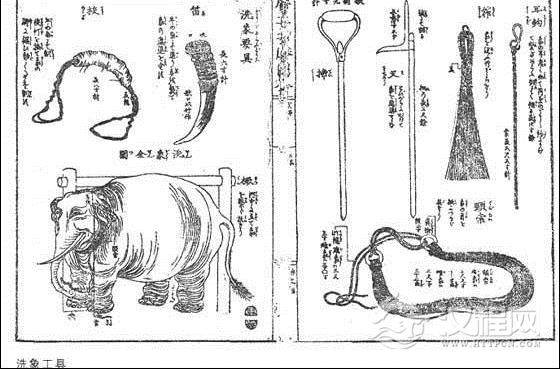 冈田玉山等人勾画出了“洗象”的工具。它们是:笛、校、橛、耳钩、筰、叉、揥、颈索。并加以注明:“笛”和“校”均为牛角制作,“笛”是吹发音令象进退的,“校”是缠象脚以制象乱动的。“橛”是立于河中缚象用的一大粗木。“耳钩”为铜制,长四寸余,因象耳广垂如荷叶,挂钩系之而洗。“榨”为洗象的竹刷,大约如董元恺《都门洗象词》所说的“双帚缚来洗刷”一般。“叉”长四寸五分,柄长三尺余,为铁制,是以叉口推象进退。“揥”九寸许,铁制,其状似滚筒。笔者理解,“揥”为洗涤象身垢物、搔痒用的。“颈索”,是缚象头于橛用。雄象颈索三尺九寸,四十四曲,雌象三尺一寸,三十二曲。颈索上有径两寸的铜环。