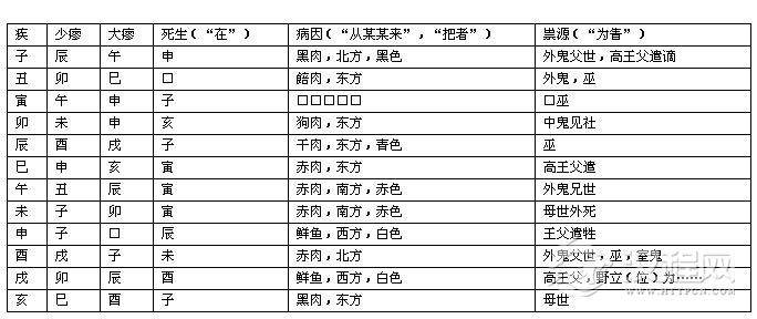 很明显,这是用五行学说来进行疾病占卜的方术,它将十天干分配到五行中,又与五方和五色相搭配,这种理论与战国秦汉间流传的《月令》是基本一致的。为了直观起见,现将云梦《日书》(甲)中该部分疾病占卜的内容转换为表格形式:
