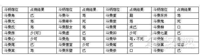 此条意谓,当天盘上的北斗柄指向地盘上的角宿时,疾病为痊愈(“已”)。根据该图的其它简文,可将这种用星宿占卜疾病吉凶的预测系统绘列如下: