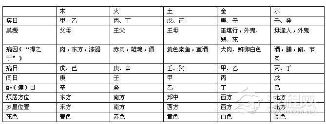4·A.《病》有二种体系:其一,以十天干配五行、五色、五方来判断病情,如: