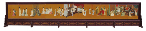 按题材划分,屏风有历史典故、文学名著、宗教神话、民间传说、山水人物、龙凤花鸟,也有将书画装裱于屏面之上或在屏面上直接书法绘画的。此外还有高雅别致的博古屏风,以古香古色的器皿及精美配饰件为题材,多配以插花,别有一番书卷气,寓意“论古不外才识学,博物能通天地人”。