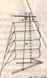 中国古代对于风力还有雨种很好应用方式,它是利用风力使一个轴发回转运动而产生动。其中最好的是立帆式风轮,它可以不受风向改变影响,总是单向回转。图左及图右是中国大活口一带的立帆式风轮的略图,在设计上十分巧妙。它的构造可以说是直接由船帆变化得来的。把同样大的八个船帆编装在一个直立的杆上,外边一部分较窄,里边一部分较宽,各个帆的正中上端由一条绳E栓上,这条绳经过滑车P,下行,系在下边的横杆上。各帆的里边用几条绳子粒紧。绳长度,以当帆面与风向垂直,结果能得到最大的风力。当帆转向逆风的一边时,帆就自动地和风向平行,结果受到风的阻力最小。最巧妙的地方就是不管风由哪一个方向吹来,风轮总是向同一个方向旋转。这实在令人十分佩服的设计。