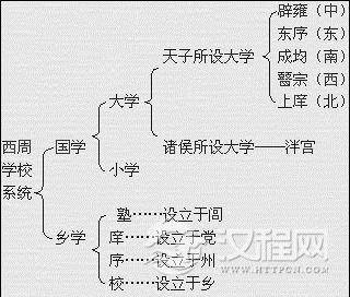 西周学校已有较完备的制度,从设置上看,可分为两类:一类是国学,一类是乡学。国学设于王城及诸侯国都。按学生的年龄与程度可分大学与小学。天子所设的大学,规模较大,有“五学”之称,即辟雍、成均、上庠、东序、瞽宗。其中辟雍是中心,四面环水。诸侯所设的大学,规模比较简单,仅有一学,半面临水,称“泮宫”。国学之外,又有乡学。乡学是地方学校,按地方行政区划设立。由于地方区域的大小不等,设学也有不同名称,如闾塾、党庠、州序、乡校等。西周学校系统可参见下表: