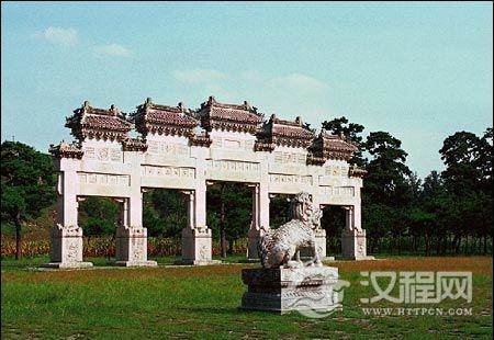 易县清西陵是雍正、嘉庆、道光、光绪四代皇帝和后妃的陵寝, 以雍正的泰陵为主陵。西陵的地形选择远不如东陵,数陵横列于永宁山南坡,并没有形成组合群体。西陵各陵布局与东陵大同小异,具有特色的是雍正泰陵大红门前的石坊群,东、西、南三面各建一座六柱五间十一楼石牌坊,围合成一个广场空间,形成宏阔的入口气势。