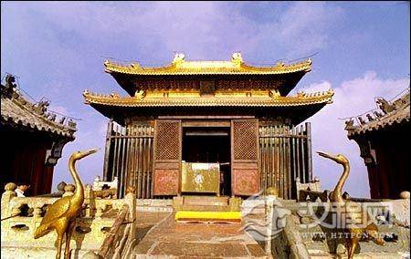武当山主峰天柱峰环山建有1.5公里长的石城墙,四面设门,名为紫禁城,城内峰顶最高处有永乐十四年(1416年)所建金殿,是一座仿木构式殿堂,构件用铜铸镏金后拼装而成。殿的通面阔5.8米,三开间,通进深4.2米,下檐斗拱七踩单翘重昂,上檐斗拱九踩重翘重昂,斗拱排列丛密,明间达到九攒,装饰化倾向十分明显。此殿虽小,规格却很高,工艺精致。殿的柱枋、斗拱、彩画、门窗、屋面瓦兽都认真模仿木构建筑式样,可视为明初官式建筑的范本之一。殿内供真武大帝披发跣足铜像,像前有玄武(龟蛇合一)、金童、玉女、水火二将铸像。殿后有父母殿。这组象征真武神居的山顶城堡,掩映于云雾缭绕之中,极具诱人的神秘色彩。