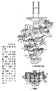 《营造法式》中每一组斗拱称一朵,在柱上的叫柱头铺作,角柱上的叫转角铺作,二柱之间阑额上的叫补间铺作。每朵最下部有一托住整组斗拱的大斗,称栌斗。栌斗一般用在柱列中线的上边。栌斗上开十字口放前后和左右两向的拱,前后向(内外)挑出的称华拱,左右向的称泥道拱。华拱可挑出一至五层,每挑一层称一跳;挑向室外的称外跳,挑向室内的称里跳。同华拱成正交的拱称横拱,除泥道拱外,最外一跳华拱头上的横拱称令拱,用以承托外檐的拱檐方(即枋)和承托内檐天花的算拱方。在柱心泥道拱和外跳令拱之间各跳跳头(即华拱头)上的横拱,都称瓜子拱。瓜子拱、泥道拱上可直接承托方木,也可再加一层横拱,称慢拱,瓜子拱、慢拱上的方木称罗汉方;宋式斗拱中向外挑出的构件除华拱外,还有斜置的下昂和上昂。下昂大体平行于屋面,昂尾压在梁下或椽(即檩)下。上昂自斗拱中心向外上方斜出,以承令拱。下昂的作用是在少增加斗拱高度的条件下增加挑出长度;上昂的作用是在少增加挑出长度的条件下增加斗拱高度,二者的作用正相反。各层拱间用斗垫托、固定,斗位于拱的中心、两端或拱与昂等相交处。华拱头上的斗叫交互斗,在横拱中心的叫齐心斗,两端的叫散斗。斗拱以榫卯结合,出跳拱昂的卯口开在下方受压区,横拱的卯口开在上方。拱上的斗用木销钉与拱结合,斜置的昂则用昂栓穿透到下层的拱中进行固定。