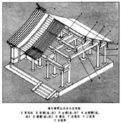 ⑤其他。梁架中的叉手、托脚被取消,纵向的联系构件减少,襻间、串等被统一成檩、垫、枋三位一体的标准作法,称“一檩三件”。