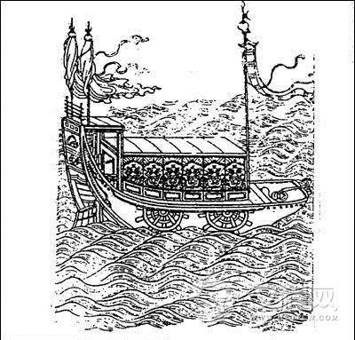 史载,祖冲之发明「千里船」,在建康 (南京) 新亭江试航,「日行百余里」。可惜,该记载未明确指出,祖冲之是否以轮代桨作为动力机械。至宋代,火药与轮船,已成为两项最重要的军事武器。宋将韩世忠在 1129 年镇江黄天荡战役中「用飞轮八楫,踏车蹈回江面」,有力打击金人完颜亮;在采石矶战役中,宋将虞允文的轮船战舰使金兵「相顾骇愕」等史事,都是明证。随轮船制造技术的提高,船中桨轮数量也从 2 轮发展到 4 轮、 8 轮、 20 轮,甚至 32 轮。