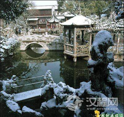 从寒碧山房西北,缓登爬山游廊,中途有亭,叫“闻木樨香轩’。这只可环视景色绝佳的中区各景。望园东部的建筑群前后参差,高低错落;相互呼应的楼阁轩屋,掩映在古木奇石之间;东南角是水池的尽头,灵空的长排空窗,古木交柯的廊屋和水连成一角美景。再看那涵碧山房的平台突出水际,层次错落分明,更有倒影清晰在目,富有山林野趣。