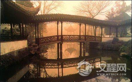 苏州狮子林不大,但其叠山理水的艺术处理较佳,那飞瀑亭的瀑布,分成三段跌落,依崖壁泻下或临空直下,犹如岩崖峭壁上飘下一层薄如蝉翼的水纱,声如激流澎湃,状若万马奔腾。一流清水运转注入荷池,其上又架以石板桥,桥上行人,仿佛置身于山谷间。这景色俨如缩小了的自然式瀑布,人工为之,妙极自然。特别是池上架桥的处里办法,可使水面空间相互贯通,似分非分,增加空间层次,又有倒影效果。