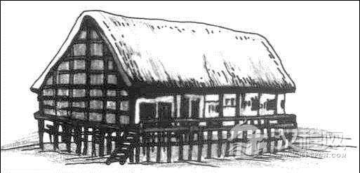 河姆渡遗址干阑式民居复原图