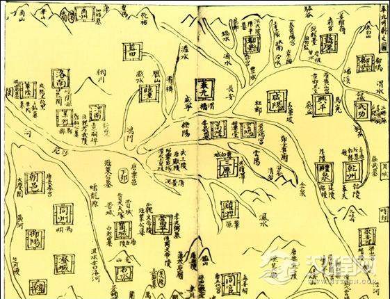 奉元州县之图(元中期) 该图主要表示了元奉元路所辖诸州县,并将各路、州、县城用双线方框绘出并注有名称,另外还绘有山河、泉谷、陵墓、庙宇、宫苑、古城以及重要地名等,该图对研究关中地区沿革地理有一定的参考价值。现藏于北京图书馆。