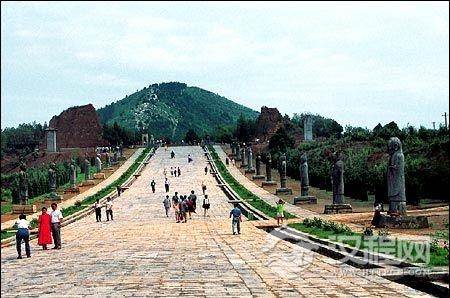 唐代因山为陵的十四陵中,以高宗乾陵保存较完整,选地也最为成功。乾陵在今陕西省乾县之北,因梁山主峰为陵,在山半开凿隧道及墓室。它的内重陵垣围在主峰的四面,东西宽1450米,南北长1538米。陵垣四面开门,门外各有双阙和一对石狮,陵垣四角建有曲尺形角阙。南面朱雀门内的献殿基址尚存。朱雀门南有一从主峰下南延的小山岭,神道就辟在岭脊上,相对设石柱、翼马、朱雀、马、人、碑等。岭之南端分为东西两支,各为一小山丘,丘顶上各建一阙,二阙间设门,即乾陵外重垣之南门,垣内即柏城。垣南门之南2850米又有一对土阙,是进入封域的标志。乾陵有陪葬墓十七座。乾陵主峰梁山高出周围诸山,轮廓浑厚对称,山南小岭及岭南端二小山丘恰可建双阙及神道。进入垣后,双阙前耸,神道步步高升,直指主峰,左右翠柏环拥,极大地衬托出主峰陵墓的气势,也就有力地表现出墓主的盛大功业,是中国古代陵墓选址最成功的例子之一。