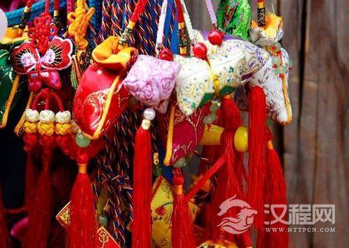 端午节小孩佩香囊,传说有避邪驱瘟之意,实际是用于襟头点缀装饰。香囊内有朱砂、雄黄、香药,外包以丝布,清香四溢,再以五色丝线弦扣成索,作各种不同形状,结成一串,形形色色,玲珑可爱。