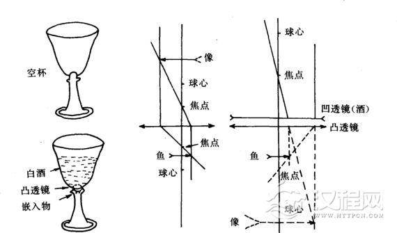 图4-7 鲫鱼杯及其成像原理示意图