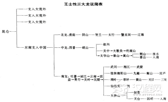 杨文衡先生曾将王士性的“三大龙”观点列成简表如下,可以清楚地表明各山系的渊源关系。