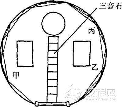 回音壁南面有一座由青石砌成的圆形平台,叫圜丘。它最高层离地面约五米,半径约11.5米。除东西南北四个出入口外,周边都围有青石栏杆。整个圜丘包括地面都是由反射性能良好的青石和大理石砌成的。平台并不平,而是从圆心向周边稍有倾斜的台面。它的声学奥妙就在这里。当人站在台中心叫一声,他自己听到的声音比平常的声音响。而且似乎是从他脚底石板下传上来的。这是由于声波被青石栏杆反射到稍有倾斜的台面,再从台面反射到人耳的缘故(图3-5)。
