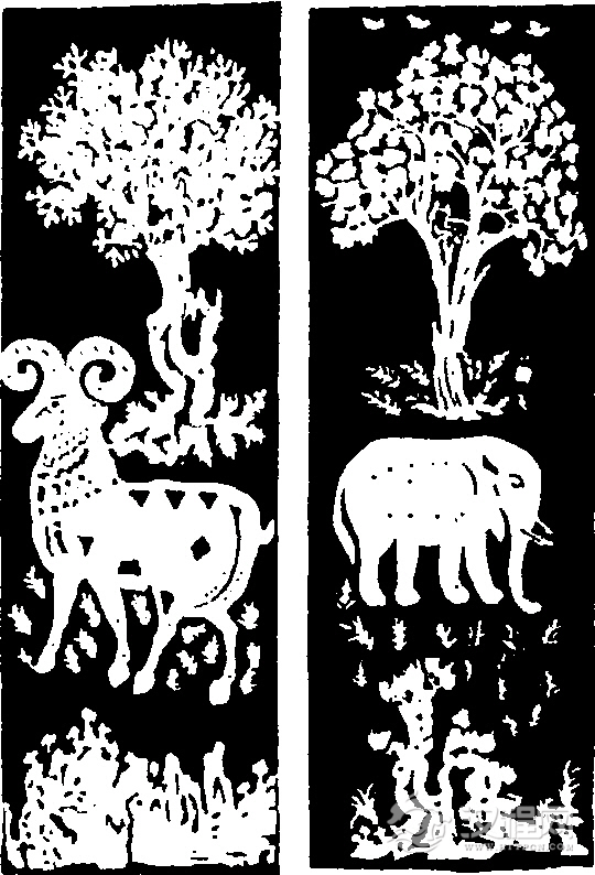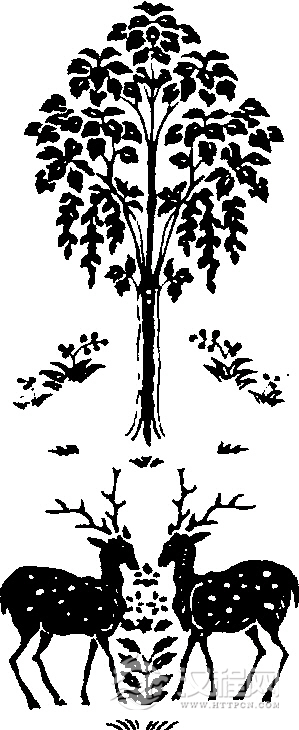 在南北朝时,我国大江南北又流行起“绞缬”、“夹缬”等染花技术,“蜡缬”也盛行起来。“绞缬”是先将待染的丝织物,按预先设计的图案用线钉缝,抽紧后,再用线紧紧结扎成各式各样的小簇花团,如蝴蝶、腊梅、海棠等等。浸染时钉扎部分难以着色,于是染完拆线后,缚结部分就形成着色不充分的花朵,很自然地形成由浅到深的色晕和色地浅花的图案。“夹缬”的技艺则有一个从低级到高级的发展过程。最初是用两块雕镂相同图案的木花板,把布、帛折叠夹在中间,涂上防染剂,例如含有浓碱的浆料,然后取出织物,进行浸染,于是便成为对称图案的印染品。其后,则采用两块木制框架,紧绷上纱罗织物,而把两片相同的镂空纸花版分别贴在纱罗上,再把待染织品放在框中,夹紧框,再以防染剂或染料涂刷,于是最后便成为白花色地或色花白地的图案,很像今天的蜡纸手动油墨印刷。但到了盛唐时期,夹缬印花的作品图案纤细流畅,又有连续纹样,已不是上述技术所能实现的。据印纺史家推测,这时已能直接用油漆之类作为隔离层,把纹样图案描绘在纱罗上,因此线条细密,图案轮廓清晰,纹样也可以连续,这种工艺可称为“筛罗花版”,或简称“罗版”。这种设想已为模拟试验所证实。唐代诗人白居易有“合罗排勘缬”(“排勘缬”的意思是依次移动两页罗花版,版版衔接,印出美丽的彩色花纹图案)的诗句,正是对当时夹缬印花的描述。夹缬也有染两、三种颜色的。现在日本京都市正仓院还保藏着我国唐代制作的夹缬和腊缬的山水、鹿草木、鸟木石、象纹等的屏风,已属艺术珍品(图6—2)。到了宋代以后,镂空的印花版开始改用桐油竹纸,代替以前的木版,所以印花更加精细;更在染液中加胶粉,调成浆状,以防染液渗化。