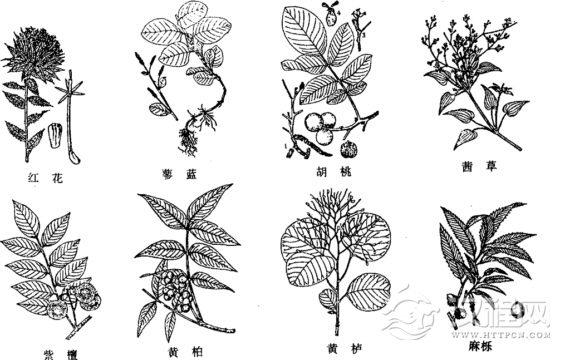 大约也是在新石器时代的中期,我国先民已开始选用天然植物色素为染料了。居住在青海柴达木盆地诺木洪地区的原始部落,那时已能用植物色素把毛线染成黄、红、褐、蓝等颜色,织出带有彩条的毛布。这类染料也不难发现,当人们采摘、摆弄鲜花野草时,某些花草中的浆汁沾在手上,蹭在衣服上,就会染上颜色,于是人们便会很自然地想利用它们来染色了。最初是把花、叶搓成浆状物,以后逐渐知道了用温水浸渍的方法来提取植物染料。选用的部位也逐渐扩展到植物的枝条、树皮、块根、块茎以及果实。通过千百年的努力,人们逐步判断出几种特别适宜作染料的植物,例如用蓝草来染蓝,用茜草来染红,用黄檗(bo)来染黄;又分别探讨出各种染料的一些习性和必要的一些加工工艺;接着由于染料的需求量猛增,人们便有意识地大规模栽培这类植物并研究栽培的方法(图6—1)。色染也就逐步成为一种专门的技艺和行业,我国古代称之为“彰施”,这个词最早见于《尚书·益稷》,它记述了舜对夏禹讲的话:“以五采彰施于五色,作服,汝明。”意思是要他用五种色彩染制成五种服装,以表明等级的尊卑。