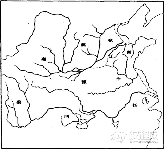 《禹贡》把当时的境域划分为九个部分,称为九州。这九州的名称为冀、兖、青、徐、扬、荆、豫、梁、雍。后来九州被认为是禹平水土后所划分的行政区划。九州的名称也见于其他书籍中,如《尔雅》在“释地”中也提到九州的名称;《周礼》在“职方”一节中,不仅列出州名,还简述了山川居民与物产等等;在秦统一前不久编写的《吕氏春秋》中“有始览”一节里,既列出州名,还和列国进行对比,现将各书中九州名称,列表对比如下:
