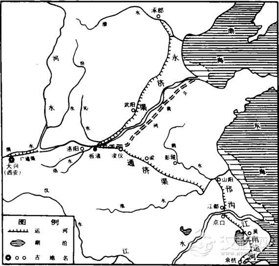通济渠为炀帝即位后所修。他营建东都(洛阳)并兴建显仁宫与规模很大的西苑,又先后动用百余万民工兴修通济渠,这条渠道自西苑引谷、洛水东达于黄河,又自板渚引黄河水经荥〔xing形〕泽入汴,又引汴东南达于淮,再通过邗沟达于他所兴建的江都宫,然后入江达海。这条河是为他巡幸南方所用,称为御河,渠旁筑有御道,沿途植柳,并置离宫40余所。这条运道的开凿曾“发河南、淮北诸郡民,前后百余万”(《通鉴·隋纪》),是隋代大运河中最为重要的一段。