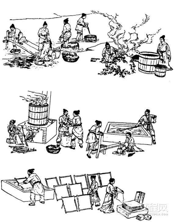 麻纸在西汉经一个世纪的发展后,至东汉蔡伦时代经过总结提高,所造之纸较前又大有改进,故推广较快。至汉末(公元2—3世纪),造纸名工辈出,最著名的是山东东莱人左伯,其所造麻纸驰名一时。赵歧《三辅决录》引韦诞奏言:“夫工欲善其事,必先利其器。用张芝笔、左伯纸及臣墨(韦诞墨),皆古法。”东汉时的字纸20世纪在西北地区也有出土,纸质较好、细而薄,可两面书写。东汉时的另一成就是造出麻纸以外的皮纸,而这同蔡伦的活动有关。三国时魏(公元220—265年)博士董巴在《大汉舆服志》中记载蔡伦在东京(洛阳)主持制造皮纸,而以野生的楮树(今名构树)之皮为原料。这是桑科木本植物,南北各地野生,其韧皮为良好造纸原料,所含纤维质地较高。古时曾以楮皮纤维织成楮布作衣料用,与麻布有同等功能,但成本显然低于麻布,因楮树无需人工栽培,随处可砍伐,经沤制后即可得纤维,再将其纺织成布。中国汉代用楮皮纤维织成的布,20世纪初在新疆曾出土。破旧的楮布因而与麻布也成为造纸原料。既然汉人可用更廉价的楮皮纤维织布代替麻布,则就有可能探索出直接用楮皮纤维造纸。这从技术上看不仅是可能的,而且是必然的结果。可以设想,用楮皮造纸需先将其于水中沤制脱胶,再用草木灰水蒸煮,以下的程序与造麻纸同,不过要随时将楮皮外表的青皮层剥去。楮皮纸的出现打开了造纸术的广泛的原料来源,导致后世桑皮纸、藤皮纸、瑞香皮纸等一系列皮纸的出现。但汉代的皮纸至今较少出土,因为出土麻纸的地点多在西北气候干燥的地带,这些地方那时仍以麻纸为主,中原及南方产皮纸的地方地下水位高,纸被破坏,故发掘古墓很少见有皮纸,不等于说当时不产皮纸。