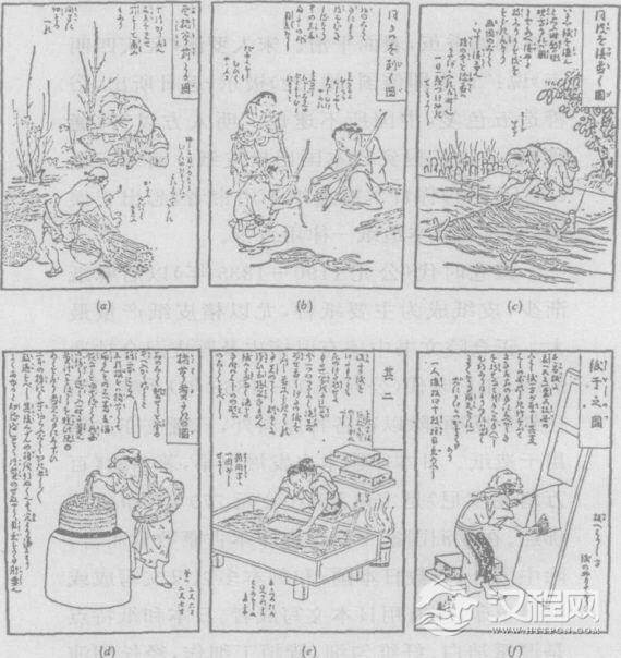 18世纪日本制楮纸工序图(a)砍伐楮条。(b)剥取楮皮。(c)浸洗楮皮。(d)蒸煮楮皮制浆。(e)抄纸。(f)木板上晾晒纸张。采自《纸漉重宝记》,1798年。