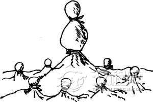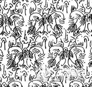 绞缬,又名撮缬或扎缬,是我国古代民间常用的一种染色方法。其扎法大体分为三类:a先在待染的织物上预先设计图案,用线沿图案边缘处将织物钉缝、抽紧后,撮取图案所在部位的织物,再用线结扎成各种式样的小绞(图23),也可以将谷物作为衬垫物,结扎在织物里,形成圆圈染取鱼子形的散布花样。b先将织物巧妙折叠,再用对称的几何小板块将其缚扎夹起来。c将坯绸作经向或对角折叠,在不同的位置上以织物自身打结抽紧或以绳绑扎。浸染后,将线拆去,扎结部位因染料没有渗进或渗进不充分,就呈现出着色不充分的花纹。绞缬花样色调柔和,花样的边缘由于受到染液的浸润,很自然地形成从深到浅的色晕,使织物看起来层次丰富,具有晕渲烂漫、变幻迷离的艺术效果。这种色晕效果是其他方法难以达到的。