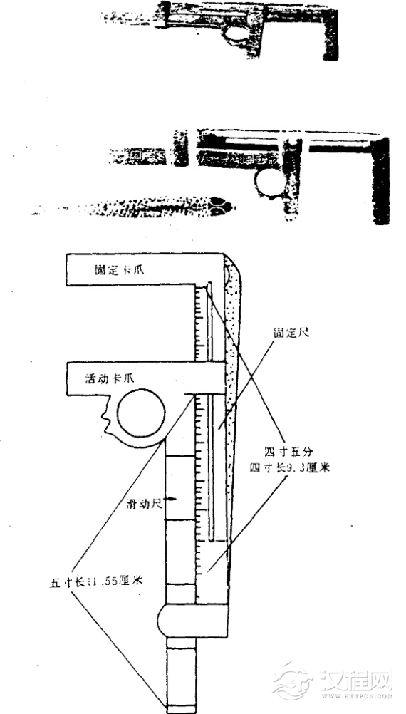 除一般的直尺外,汉代已有了专用的测长工具——卡尺。所见两支卡尺,一支藏中国历史博物馆,另一支藏北京市艺术博物馆。尺正面刻有铭文“始建国元年正月癸酉朔日制”,铭文表明此尺制作于新莽始建国元年。卡尺由固定尺和滑动尺两部分组成,两端均有成矩形的量爪。固定尺正面刻40分格(即四寸),上部有一鱼鳞形柄,中间开一导槽,滑动尺正面刻有五个寸格(未刻分),量爪与尺身相联处有环状拉手,引环可使滑动尺移动,当两尺的量爪靠拢时,固定尺与滑动尺等长,两尺刻线大体相对。