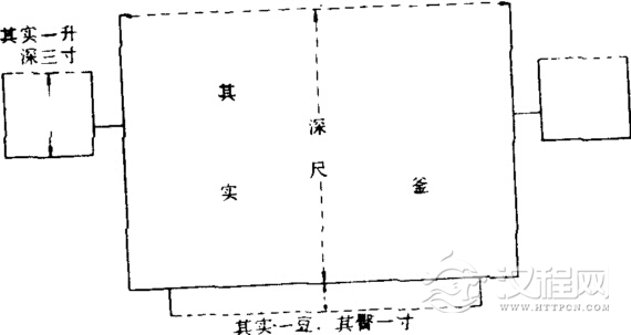 “栗氏为量,改煎金锡则不耗,不耗然后权之,权之然后准之,准之然后量之,量之以为鬴〔fu釜〕,深尺,内方尺而圜其外,其实一鬴。其臀一寸,其实一豆。其耳三寸,其实一升。重一钧。其声中黄钟之宫。概而不税。其铭曰:‘时文思索,允臻其极,嘉量既成,以观四国,永启厥后,兹器维则’。”