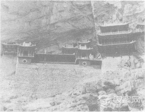 并不是所有佛寺都采取这种中轴对称、十分规整的形式。在我国西藏地区,信奉的是藏传佛教,宗教内容多而复杂。反映在佛寺上除佛殿、经堂外,还要有保存活佛遗体的灵殿、众多佛徒诵经的转经廊以及活佛的办公用房、喇嘛的住宅等等。这种佛寺多建在山上,所以不采取严格的中轴对称,而是随山势起伏灵活自由地布置。如西藏日喀则的扎什伦布寺和河北承德仿藏式的普陀宗乘庙都属这种类型。山西浑源县的悬空寺更是一种奇特的形式,所有殿堂都用插入山石中的悬梁支撑,悬空建造在陡山壁上,上下交错重叠,表现出古代工匠的高超技艺和大胆的想象能力(图13)。