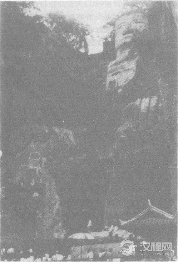 石窟也和佛塔一样,自印度传入中国后,它的形制也逐渐中国化了。中国的石窟以在里面供奉佛像为主。在敦煌和大同云冈的较早期石窟中还有中心柱式的窟,即在石窟中心有一石柱,石柱有的雕成塔形,有的在上面雕满佛龛,佛徒们绕着中心柱礼拜。后来的石窟多在正面壁上雕佛像,布置如同佛殿里面一样;有的还在石窟的三面都雕有佛像,周围布满了各种建筑和动、植物的装饰雕刻,雕刻外涂以彩绘,组成为一个富丽多彩的环境,象征着理想的佛教天国。这种石窟的佛像越雕越大,由窟内发展到窟外,到唐代,露天大佛更得到发展。洛阳龙门奉先寺大佛高17米,佛前有广场,便于人群瞻仰。我国最大的佛像是四川乐山凌云寺的大佛(图18)。大佛是依凌云山的天然岩石雕成,与崖同高,从头到脚共71米,光是佛的鼻子就长达5米多,肩宽24米,它的脚背上可容上百人,是世界第一大佛。从公元713年开凿,到公元803年才完成,前后历时90年。原来佛像全身都有彩绘,外面建有七层高的楼阁遮盖着大佛。明代楼阁被火烧毁,如今露天的大佛巍然屹立在岷江之滨,只有在江心远处方能欣赏到它的全貌。在石窟中,数量最多,经历时间最长的还是甘肃敦煌的莫高窟,自公元4世纪起直至元代共经历了10多个朝代,至今留下来有洞窟492个。因为这个地区的石质属沙砾岩,整体比较疏松,不宜雕刻,所以这里的石窟与云冈、龙门的不同,一般都用壁画和泥塑的形式来表现佛的世界,而且在窟前还建有门廊式的建筑以保护石窟。如今保留下来的几处宋代窟檐建筑,是我国早期木建筑的珍贵实物。
