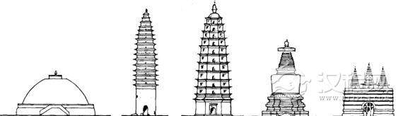 (3) 塔 塔是佛教中一种专门建筑,它的形成有一个过程。相传释伽牟尼得道成佛后的第45年,也就是他80岁高龄时,在传道的路上得了重病,最后病死在树林中的吊床上。佛逝世后,遗体被众弟子火化,所得佛骨被弟子们分别拿到各地去安奉。他们把佛骨埋在地下,上面堆起一座像中国坟头似的土堆,在印度梵文中称为“窣堵坡”(STupa),或称“浮图”,翻译成中文称“塔婆”,后来就简称为“塔”了。所以塔可以说原是埋葬佛骨的纪念物,作为佛的象征,供信徒们顶礼膜拜。它最初的形式是一座覆盆状的圆形坟,在它的上面有伞和竿等做为装饰(图16)。