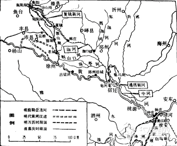 最早在淮北开的一条新河叫夏镇新河。嘉靖五年(公元1526年),黄河在鲁西曹县、单县等地决口,冲毁了昭阳湖以西一段运河。南北漕运被阻,明朝遂决定穿凿新河。嘉靖七年(公元1528年),以盛应期为总河都御史,征集近10万夫役穿凿。工程过半,由于盛氏督工太急,怨声四起,又值大旱成灾,为防止爆发变乱,中途停工,只好草率修复旧道,勉强通航。嘉靖四十四年(公元1565年),黄河又在江苏丰县、沛县决口,昭阳湖以西一段运道堵塞更甚。第二年,遂再度兴工,穿凿新河,由工部尚书朱衡主持,嘉靖四十六年(公元1567年)完工。这段新河,北起南阳湖南面的南阳镇,经夏镇(今微山县治所)到留城(已陷入微山湖中),长140里,史称夏镇新河或南阳新河。旧河在昭阳湖西,原属会通河南段,易受黄河泛滥冲击。新河在湖东,有湖泊可容纳黄河来水,比较安全(图3)。