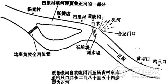 贾鲁是一位勇于负责、敢于创新的水利官员,当时白茅堤决口宽400步,中流深三丈余,波涛汹涌,极难堵塞。他采用一系列的创造性措施,加以解决。第一步是在决口上方穿一直河,以代替原来比较弯曲,其主溜直冲决口的一段河道。这就大大地降低了堵口的难度。第二步是在决口上方的直河上,修建了刺水堤和石船斜堤,尽量把河水导向对面。这就进一步降低了堵口的困难。最后,终于顺利地完成堵口,实现了挽河南流的任务。这些新技术,在堵口工程上,具有很大的意义(图15)。