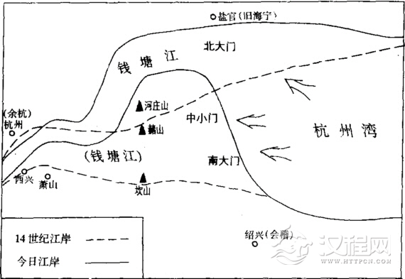 钱塘江口水面广阔,从南岸到北岸达几百里。由于中间屹立着一些岛屿,形成三条水道,叫作南大门、中小门和北大门。坎山-赭山间为南大门,赭山-河庄山间为中小门,河庄山到北岸为北大门。13世纪以前,无论是钱塘江水还是海潮,主溜基本上走南大门。后来,由于钱塘口沙嘴变化等原因,“海失故道”,主溜逐渐移到北大门。
