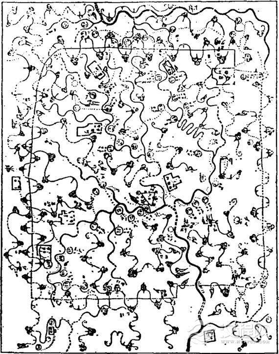 驻军图是一幅彩色军事地图,河流湖泊用蓝色,山脉用黑线,黑底套红的框框标示军队驻地,各驻军防线用红色实线划分,红色虚线表示军用道路,黑圈表示居民点。图中共绘出九支驻军的布防、指挥点等状况。