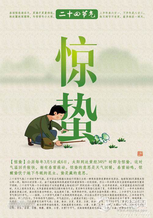 惊蛰:蛰是藏的意思。惊蛰是指春雷乍动,惊醒了蛰伏在土中冬眠的动物。