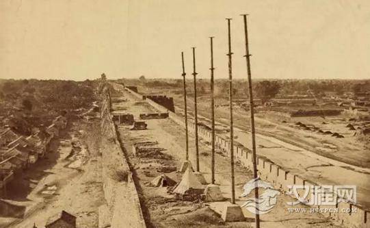 安定门迤东的内城北垣上的清军大炮,城墙内建筑是雍和宫,1860-10-14