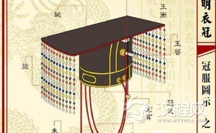 现在来说帝王的冠冕。在中国,毫无疑问,是拥有最高权力者才可戴的帽子。大体由“綖”、“旒”、“缨”、 “紞”、“纩”、“紘”等组成。綖,就是头顶上那块长方板,前圆后方,寓意天圆地方;旒,就是悬挂在方板前后的那个珠玉帘,一般用五彩丝线穿五彩珠玉串连而成;缨,冕板左右垂下的红绸绳;紞,有专门用途,也是丝做成的线绳,线绳下端有个黄色绵丸,专用名词叫黈纩;纩,其实就是挂在紞头上的玉,谓之瑱,因为两块瑱正好位于左右两只耳朵旁,所以又名充耳、塞耳;冠冕如何固定在脑袋上?用一根叫做玉笄的东西,其实就是俗称的簪子;玉笄的两端绕颔下系朱红丝带,这样才能把整个冠冕固定住,叫做纮。