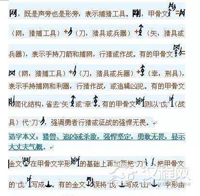 造字本义:猎兽、追凶或杀敌,强悍坚定,勇敢无畏,显示大丈夫气概。