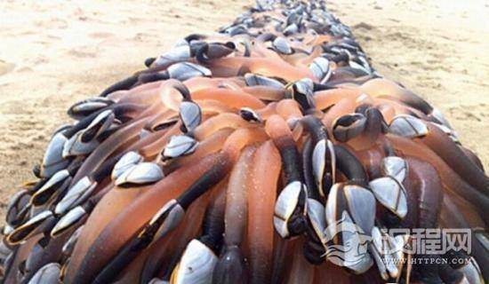 当海水慢慢退去后,大家迅速围观上去,此时只见沙滩上正有一大堆不明软体物体疯狂地蠕动着,看着十分骇人!这堆奇怪的物体特别像软糖,还带着灰白色的硬壳,整个一大串都在歪七扭八地甩来甩去,这一幕让大家胆战心惊,生怕是海里冒出来的什么海怪!