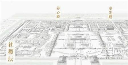 如图所示,太庙是祭祀祖宗的家庙,位于故宫结构里的左边(故宫坐北向南,所以从方位上看太庙在左边),社稷坛(社稷坛是政权之象征)则在右边。