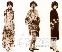(近代)二十年代妇女服饰——二十年代的中晚期,是近代妇女服饰演变的一个重要阶段。总的看来,这个时期的服装,以采用西式者为多,传统特色的保留则较少。经过一个时期,较普遍地采用了一种既适合于我国妇女穿着,又吸收西式优点的服式,即“旗袍”。除旗袍之外还有袄裙服装样式,特点为立领、宽袖口、露肘的短袄及长裙。左图为穿窄袖袄、素裙的妇女。左图为穿西式茶舞服的妇女。中图为穿印花连衣裙的妇女。右图为穿衫、裙式晨礼服的妇女。