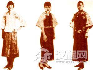 (近代)二十年代妇女服饰——二十年代的中晚期,是近代妇女服饰演变的一个重要阶段。总的看来,这个时期的服装,以采用西式者为多,传统特色的保留则较少。经过一个时期,较普遍地采用了一种既适合于我国妇女穿着,又吸收西式优点的服式,即“旗袍”。除旗袍之外还有袄裙服装样式,特点为立领、宽袖口、露肘的短袄及长裙。左图为穿窄袖袄、素裙的妇女。中、右图为穿小马甲、大袖袄、筒裙的妇女。