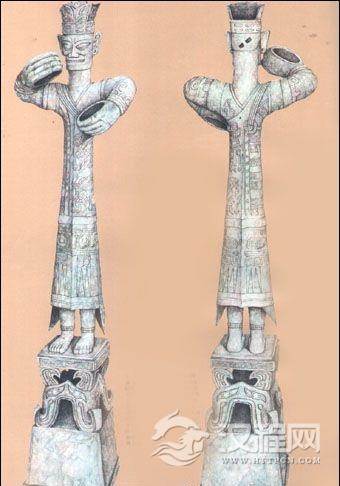 汉代头戴花形冠、上穿V领左衽窄袖长袖上衣,下着裳左右衣裾均绕至身后,裳后两侧垂有燕尾形尖角,衣襟上饰龙纹,裳上为回纹和异兽纹,小腿上戴有脚镯,耳上有孔原来可能带有耳环,束回纹额带后脑额下有二个斜方形孔,原来可能插有笄。(四川广汉三星堆遗址出土的晚商大型穿龙衣的青铜立人)。这尊像铸造精美,除面部、手部的造型比较夸张外其余各部细节都很真实,衣服上的花纹图案和系衣用的绳带、衣钮都刻画得十分清晰,是非常难得的服饰研究资料。