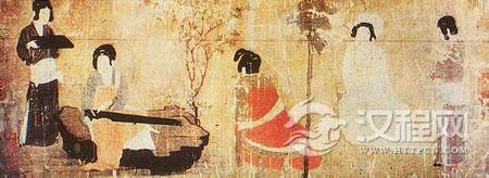 画中描绘五个女性,其中三个系贵族妇女。一女坐在盘石上,正在调琴,左立一侍女,手托木盘,另一女坐在圆凳上,背向外,注视着琴音,作欲饮之态。又一女坐在椅子上,袖手听琴,另一侍女捧茶碗立于右边,画中贵族仕女曲眉丰肌、秾丽多态,反映了唐代尚丰肥的审美观,从画中仕女听琴品茗的姿态也可看出唐代贵族悠闲生活的一个侧面。