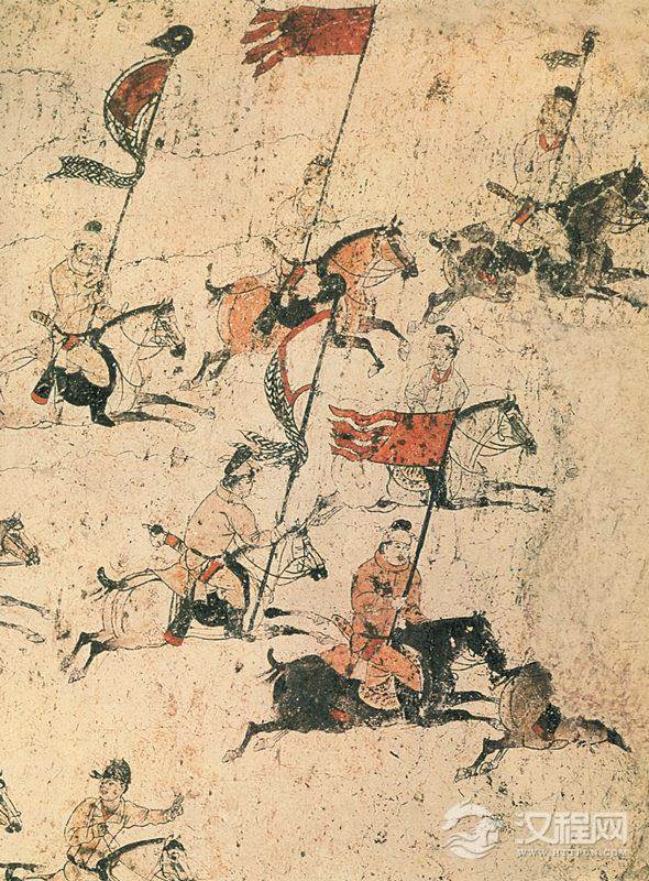 画中有二名骑手身穿窄袖袍,下着裤、靴,即为胡服。