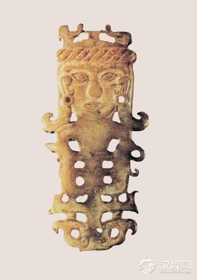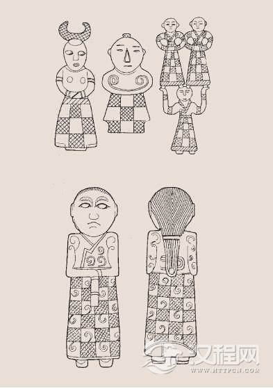由商到西周、春秋、战国,前后约一千年,大致可以分作三个历史阶段看它的演变。较早时期,除特殊人物在特种情形下的衣服式样,我们还不大明确,至于一般统治者和奴隶,衣长齐膝似乎是一种通例。由此得知,汉代石刻作的大禹像和几个历史上名王名臣像,倒还有些古意,非完全出于猜想。因为至少三千年前的商代人,就多是这个样子了。当时人已穿裤子,比后人说的也早过一千年。商代人衣服材料主要是皮革、丝、麻。由于纺织术的进展,丝、麻已占特别重要地位,奴隶主和贵族,平时常穿彩色丝绸衣服,还加上种种织绣花纹,用个宽宽的花带子束腰。奴隶或平民,则穿本色布衣或粗毛布衣。贵族男子头上已常戴帽子,是平顶筒子式,用丝绸作成,直流行到春秋战国不废。女人有把发拢成髻,横贯一支骨簪的。也有用骨或玉作成双笄,顶端雕刻个寸来大小鸟形(鸳鸯或凤凰)两两相对,斜插头顶两侧,下垂卷发齐肩,颈项上挂一串杂色闪光玉石珠管串饰。历史上著名的美人妲己当时大致就应这么打扮。女子成年才加笄,所以称“及笄”,表示可以成婚。小孩子已有头顶上梳两个小角儿习惯,较大的可能还是编辫发。平民或奴隶有裹巾子作羊角旋斜盘向上的,有包头以后再平搭折成一方角的,还有其他好些样式,都反映在玉、铜、陶人形俑上。样子多和现在西南居住的苗、瑶族情形差不多。(这不是偶然巧合,事实上很多三千年前古代图案花纹还可从西南兄弟民族编织物上发现)许多野生植物如槐花、栀子、橡斗已用来作染料,并且还种植了蓝草,能染出各种不同的青蓝色,种茜草和紫草专染红、紫诸色。